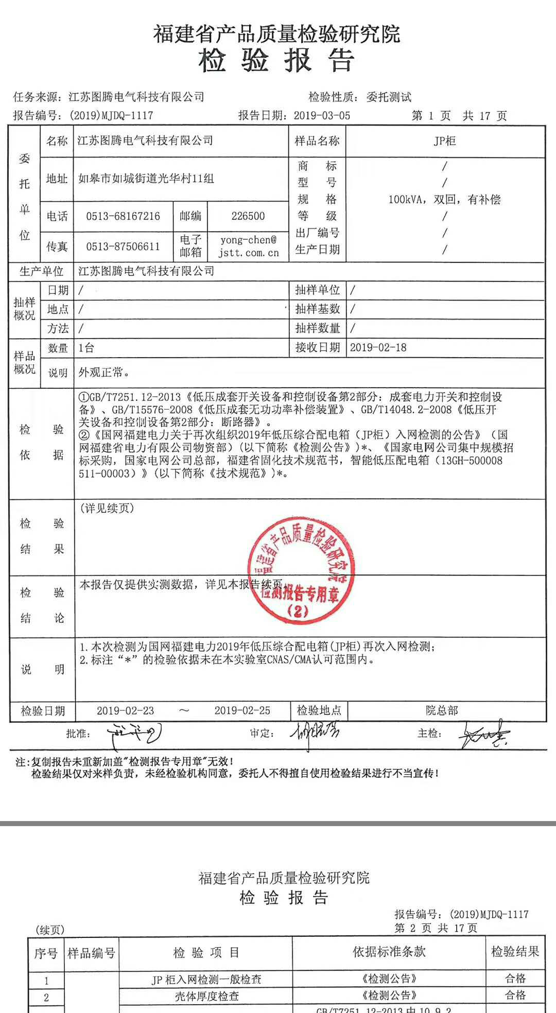 江蘇圖騰電氣科技有限公司綜合配電箱順利通過福建省入圍檢測(cè)!