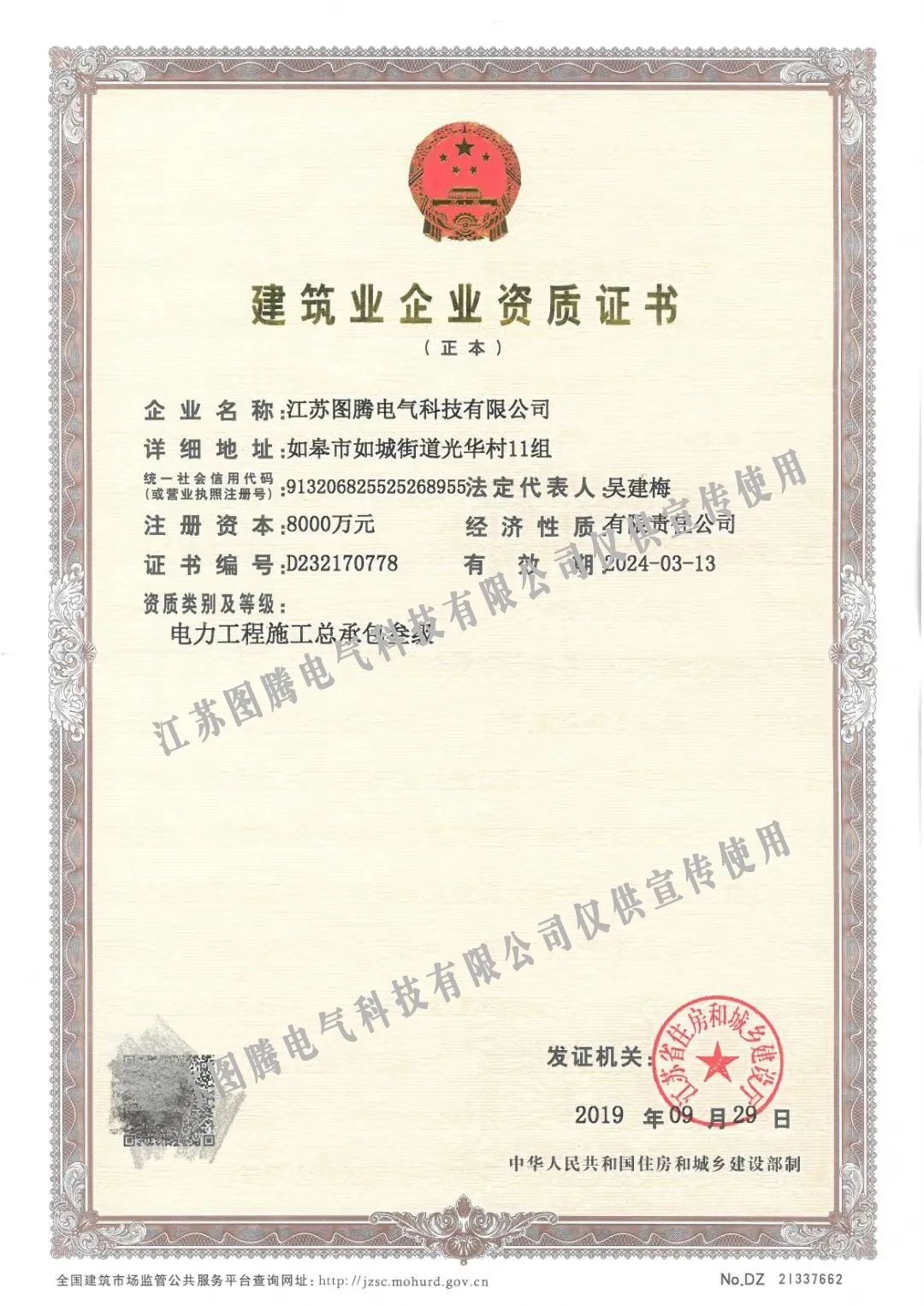 此外,圖騰電氣公司早在之前已取得“電力工程施工總承包叁級(jí)資質(zhì)”。隨著公司資質(zhì)等級(jí)結(jié)構(gòu)和資質(zhì)體系的不斷優(yōu)化完善,公司綜合實(shí)力得到了提升,為公司后續(xù)市場(chǎng)開(kāi)發(fā)、業(yè)務(wù)范圍拓寬提供了堅(jiān)強(qiáng)保障,增強(qiáng)了公司在行業(yè)內(nèi)的核心競(jìng)爭(zhēng)力,對(duì)公司跨越式、高質(zhì)量發(fā)展具有十分重要的意義。
