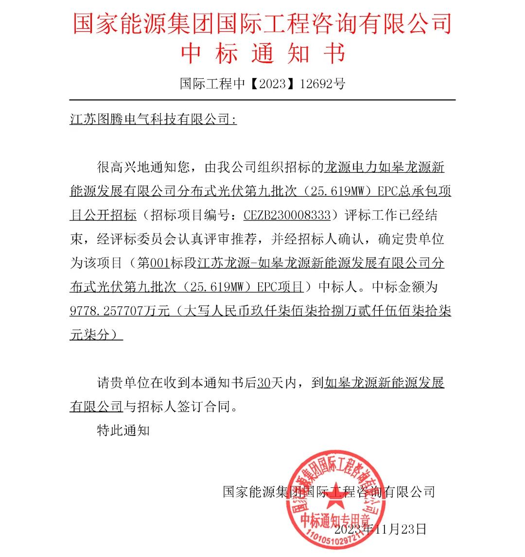 歲末沖刺,一路“標(biāo)”升!近日,圖騰電氣成功中標(biāo)如皋龍源新能源發(fā)展有限公司分布式光伏第九批(25.619MW)EPC總承包項目,中標(biāo)金額為9778.257707萬元。...